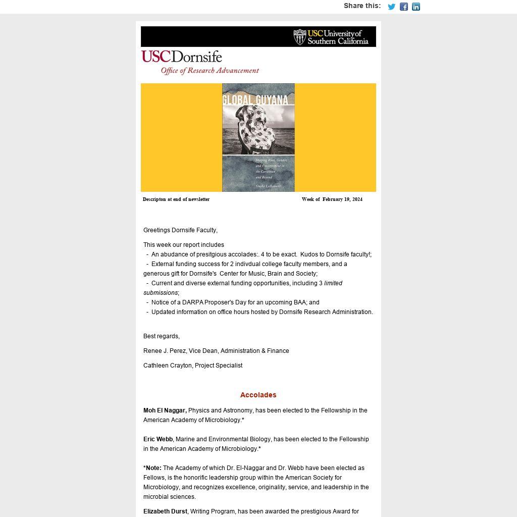 This week our report includes - An abudance of presitgious accolades:. 4 to be exact. Kudos to Dornsife faculty!; - External funding success for 2 indivdual college faculty members, and a generous gift for Dornsife's Center for Music, Brain and Society; - Current and diverse external funding opportunities, including 3 limited submissions; - Notice of a DARPA Proposer's Day for an upcoming BAA; and - Updated information on office hours hosted by Dornsife Research Administration.
