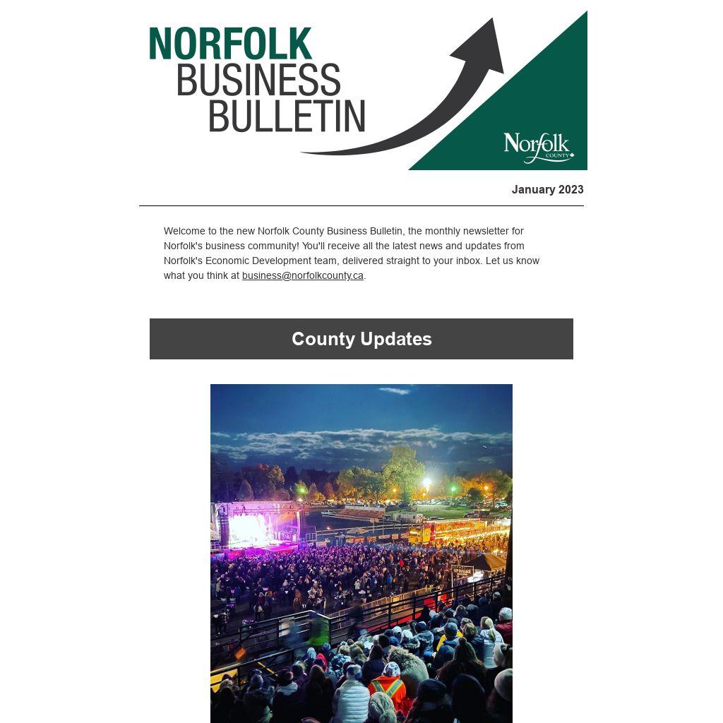 Welcome to the new Norfolk County Business Bulletin, the monthly newsletter for Norfolk's business community! You'll receive all the latest news and updates from Norfolk's Economic Development team, delivered straight to your inbox. Let us know what you think at business@norfolkcounty.ca.