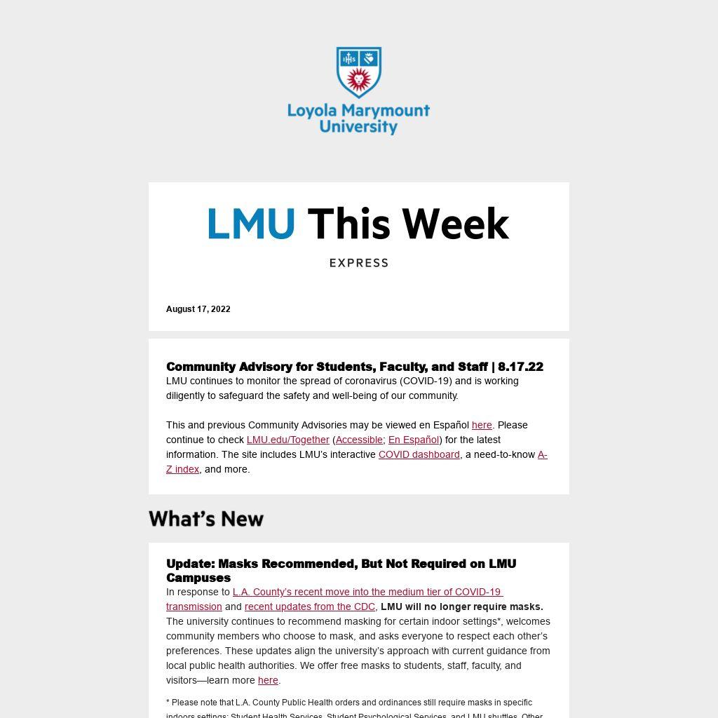 * Please note that L.A. County Public Health orders and ordinances still require masks in specific indoors settings: Student Health Services, Student Psychological Services, and LMU shuttles. Other university departments or units are not authorized to set their own masking protocols.