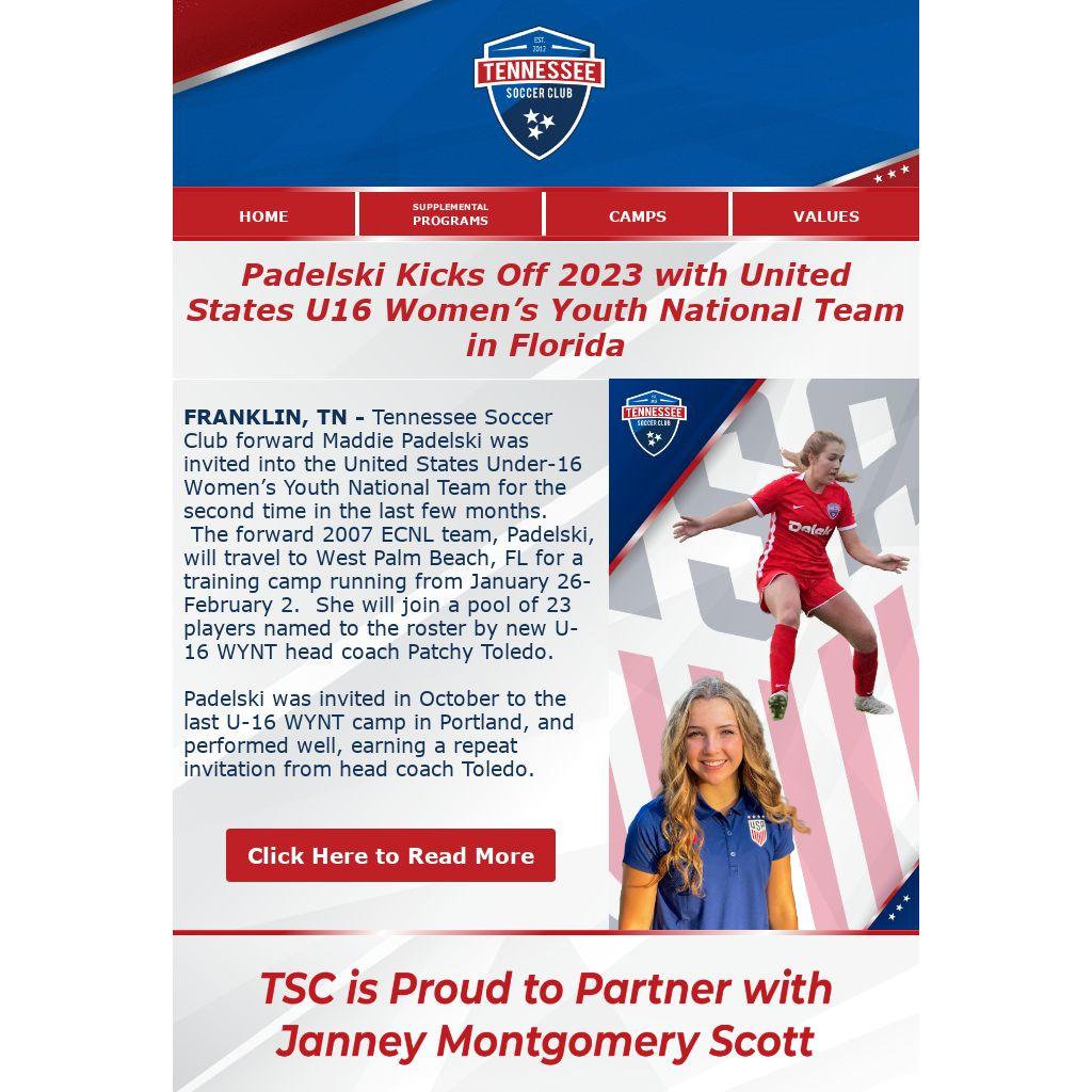 FRANKLIN, TN - Tennessee Soccer Club forward Maddie Padelski was invited into the United States Under-16 Women’s Youth National Team for the second time in the last few months. The forward 2007 ECNL team, Padelski, will travel to West Palm Beach, FL for a training camp running from January 26-February 2. She will join a pool of 23 players named to the roster by new U-16 WYNT head coach Patchy Toledo.