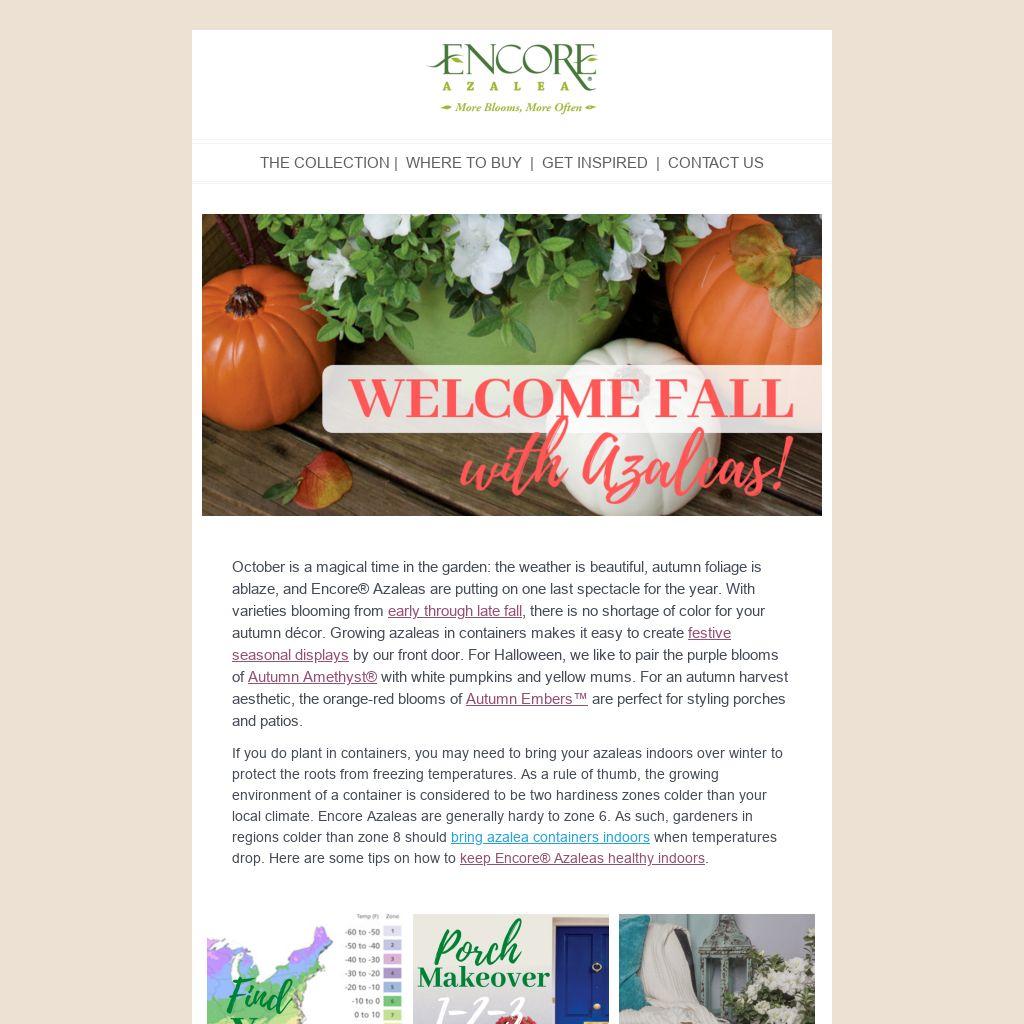 October is a magical time in the garden: the weather is beautiful, autumn foliage is ablaze, and Encore® Azaleas are putting on one last spectacle for the year. With varieties blooming from early through late fall, there is no shortage of color for your autumn décor. Growing azaleas in containers makes it easy to create festive seasonal displays by our front door. For Halloween, we like to pair the purple blooms of Autumn Amethyst® with white pumpkins and yellow mums. For an autumn harvest aesthetic, the orange-red blooms of Autumn Embers™ are perfect for styling porches and patios.