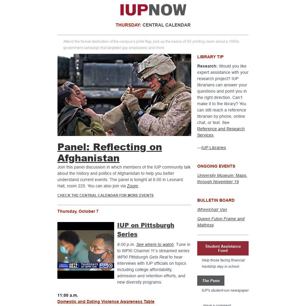 Distributed to IUP employees and students three days a week, IUP Now is the official newsletter of Indiana University of Pennsylvania. It features news from across the IUP website, compiled by the Division of Marketing and Communications. Find out how to get your news and events in IUP Now.