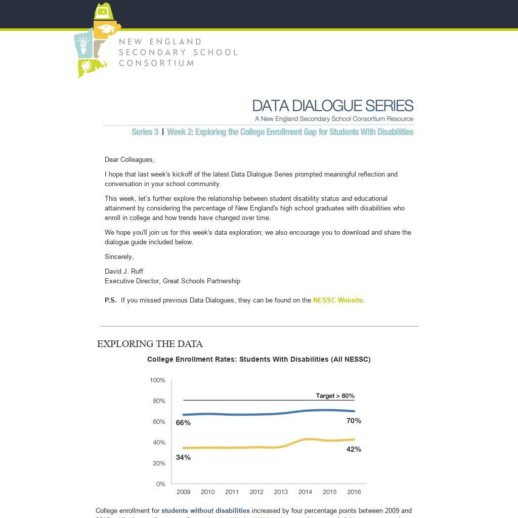 You may remember from last week's data that students with disabilities graduate from high school at substantially lower rates as compared to students without disabilities. Given this trend, it is not surprising that similar patterns appear in the college enrollment data. And similar to high school graduation trends, the substantial gap in college enrollment rates between students with disabilities and their peers has remained steady over time.