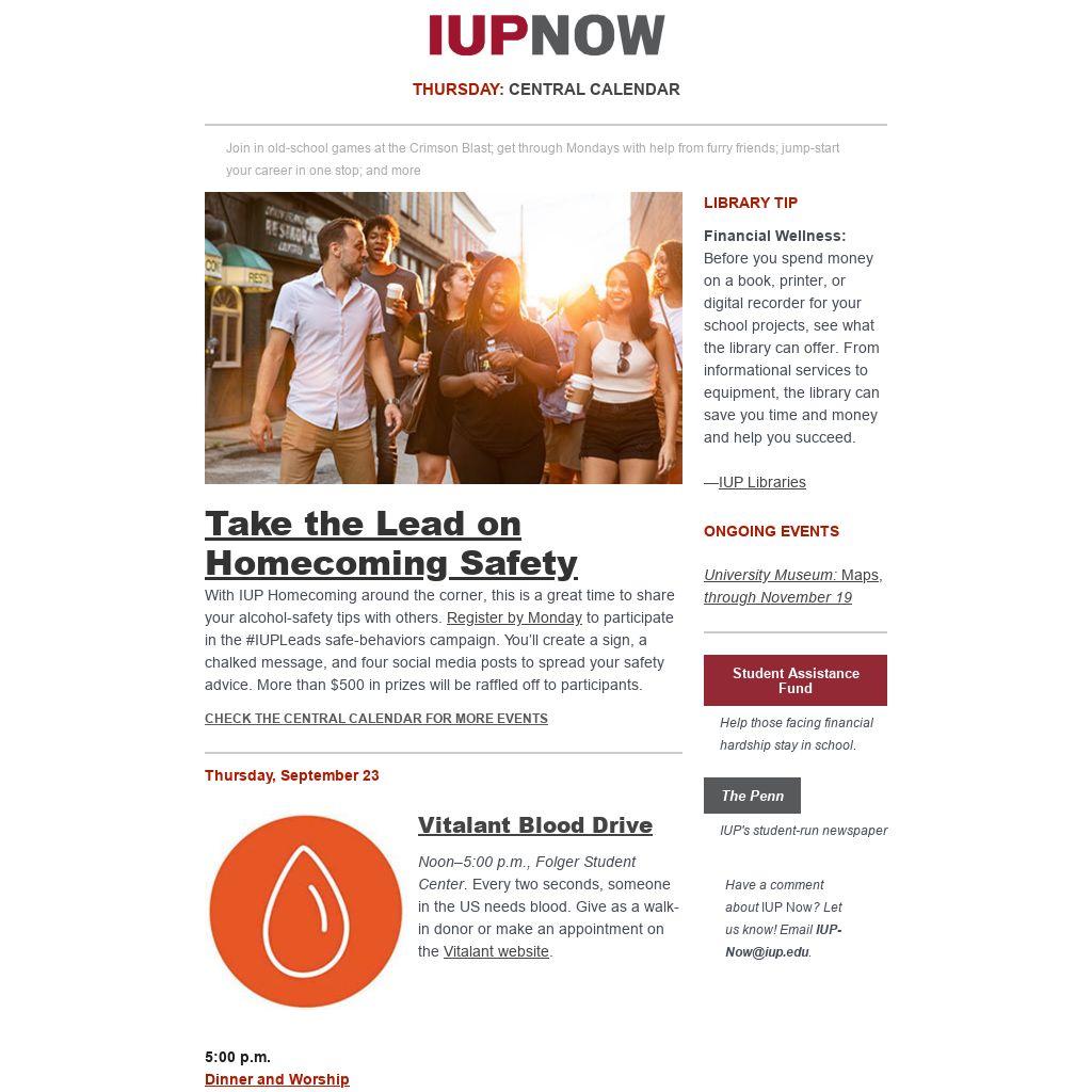 Distributed to IUP employees and students three days a week, IUP Now is the official newsletter of Indiana University of Pennsylvania. It features news from across the IUP website, compiled by the Division of Marketing and Communications. Find out how to get your news and events in IUP Now.