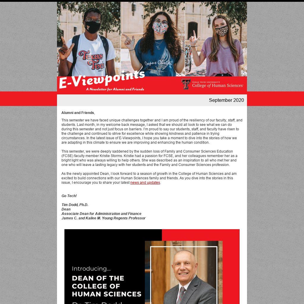 This semester we have faced unique challenges together and I am proud of the resiliency of our faculty, staff, and students. Last month, in my welcome back message, I asked that we should all look to see what we can do during this semester and not just focus on barriers. I’m proud to say our students, staff, and faculty have risen to the challenge and continued to strive for excellence while showing kindness and patience in trying circumstances. In the latest issue of E-Viewpoints, I hope you take a moment to dive into the stories of how we are adapting in this climate to ensure we are improving and enhancing the human condition.