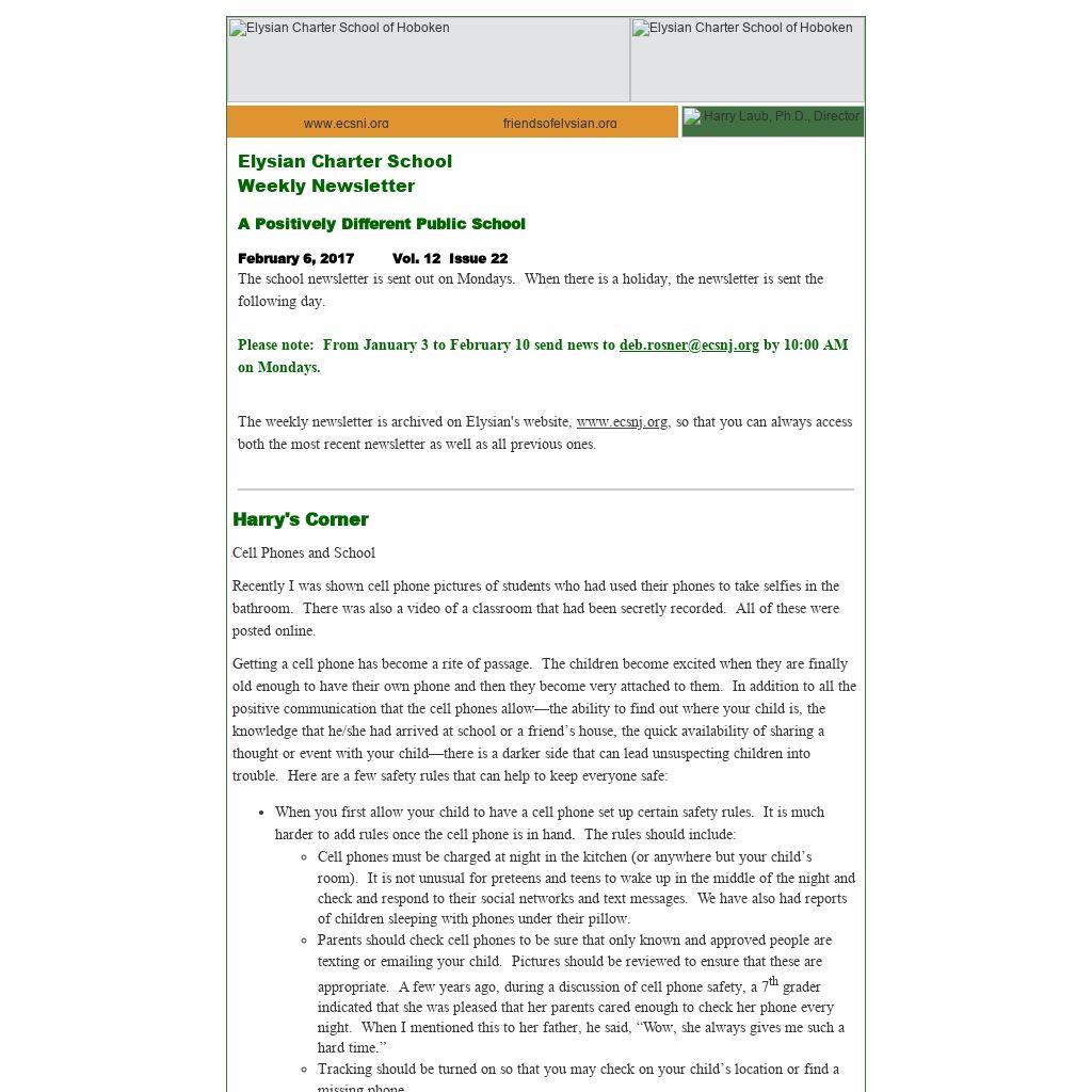 The weekly newsletter is archived on Elysian's website, www.ecsnj.org, so that you can always access both the most recent newsletter as well as all previous ones.