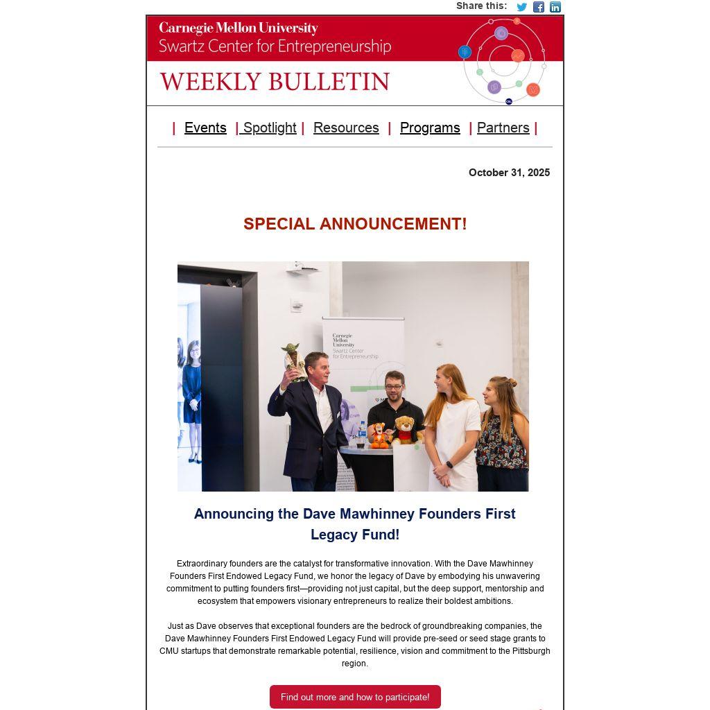Just as Dave observes that exceptional founders are the bedrock of groundbreaking companies, the Dave Mawhinney Founders First Endowed Legacy Fund will provide pre-seed or seed stage grants to CMU startups that demonstrate remarkable potential, resilience, vision and commitment to the Pittsburgh region.