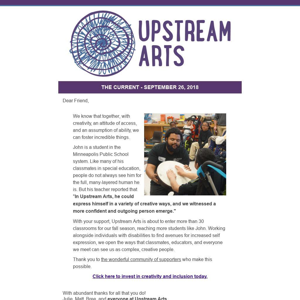 With your support, Upstream Arts is about to enter more than 30 classrooms for our fall season, reaching more students like John. Working alongside individuals with disabilities to find avenues for increased self expression, we open the ways that classmates, educators, and everyone we meet can see us as complex, creative people.