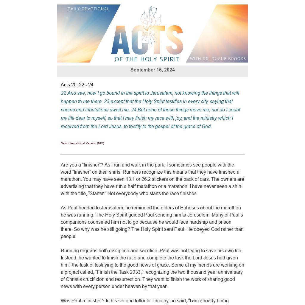 Running requires both discipline and sacrifice. Paul was not trying to save his own life. Instead, he wanted to finish the race and complete the task the Lord Jesus had given him: the task of testifying to the good news of grace. Some of my friends are working on a project called, “Finish the Task 2033,” recognizing the two thousand year anniversary of Christ’s crucifixion and resurrection. They want to finish the work of sharing good news with every person under heaven by that year.