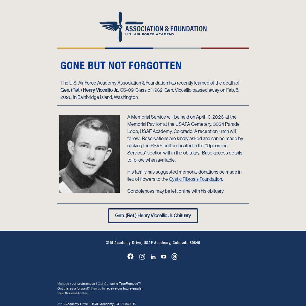The U.S. Air Force Academy Association & Foundation has recently learned of the death of Gen. (Ret.) Henry Viccellio Jr., CS-09, Class of 1962. Gen. Viccellio passed away on Feb. 5, 2026, in Bainbridge Island, Washington.