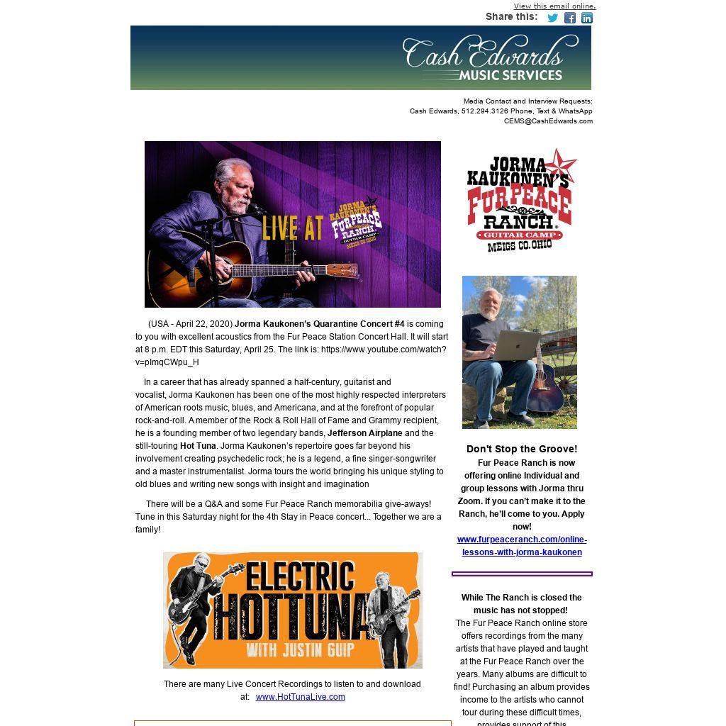 (USA - April 22, 2020) Jorma Kaukonen’s Quarantine Concert #4 is coming to you with excellent acoustics from the Fur Peace Station Concert Hall. It will start at 8 p.m. EDT this Saturday, April 25. The link is: https://www.youtube.com/watch?v=pImqCWpu_H
