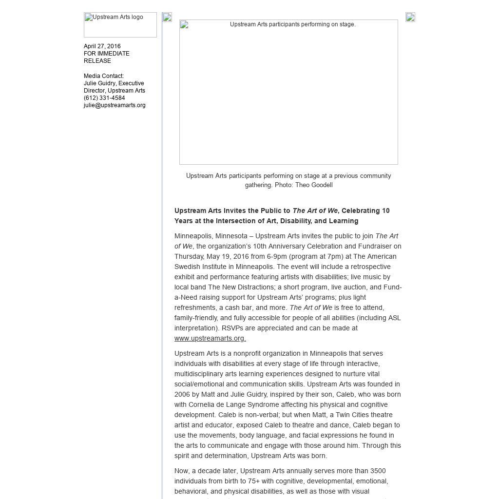 Upstream Arts Invites the Public to The Art of We, Celebrating 10 Years at the Intersection of Art, Disability, and Learning Minneapolis, Minnesota – Upstream Arts invites the public to join The Art of We, the organization’s 10th Anniversary Celebration and Fundraiser on Thursday, May 19, 2016 from 6-9pm (program at 7pm) at The American Swedish Institute in Minneapolis. The event will include a retrospective exhibit and performance featuring artists with disabilities; live music by local band The New Distractions; a short program, live auction, and Fund-a-Need raising support for Upstream Arts’ programs; plus light refreshments, a cash bar, and more. The Art of We is free to attend, family-friendly, and fully accessible for people of all abilities (including ASL interpretation). RSVPs are appreciated and can be made at www.upstreamarts.org. Upstream Arts is a nonprofit organization in Minneapolis that serves individuals with disabilities at every stage of life through interactive, multidisciplinary arts learning experiences designed to nurture vital social/emotional and communication skills. Upstream Arts was founded in 2006 by Matt and Julie Guidry, inspired by their son, Caleb, who was born with Cornelia de Lange Syndrome affecting his physical and cognitive development. Caleb is non-verbal; but when Matt, a Twin Cities theatre artist and educator, exposed Caleb to theatre and dance, Caleb began to use the movements, body language, and facial expressions he found in the arts to communicate and engage with those around him. Through this spirit and determination, Upstream Arts was born. Now, a decade later, Upstream Arts annually serves more than 3500 individuals from birth to 75+ with cognitive, developmental, emotional, behavioral, and physical disabilities, as well as those with visual impairments and those who are Deaf or Hard of Hearing. This year, the organization is running over 100 programs in partnership with schools, Adult Day Programs, and other community organizations across the Minneapolis/St. Paul metro area, Milwaukee, and beyond. All Upstream Arts programs are taught by professional artists who are among the most accomplished actors, directors, playwrights, poets, dancers, musicians, and visual artists in the region. Upstream Arts’ work begins from the core belief that infusing arts strategies into education and services for individuals with disabilities at every stage of life innovates teaching and learning for all kinds of diverse learners, and provides opportunities for communities that have historically been denied voice and choice to express themselves and tell their stories through the arts. Upstream Arts has been widely recognized as an innovative leader at the intersection of art, disability, and learning, with program support from the National Endowment for the Arts, Minnesota State Arts Board, F.R. Bigelow Foundation, Saint Paul Foundation, Pohlad Family Foundation, American Association of University Women, and California Institute of Contemporary Arts Foundation, among others. This past year, Upstream Arts also was selected to receive an award of $100,000 from The Bush Foundation as part of its Community Creativity Cohort, a one-time program designed to recognize and learn from exemplary organizations that meaningfully engage people in the arts and integrate the arts into public life. The Art of We event on May 19, 2016 will celebrate the past decade of Upstream Arts’ groundbreaking work while looking ahead at the next ten years to come. Central to the evening will be a retrospective exhibit of photography, paintings, and poetry from the organization’s programs between 2006-2016. Guests also can enjoy live music by The New Distractions, a Minneapolis four-piece band playing a range of classic blues, swing, R&B and folk rock tunes, with unique arrangements and covers of artists from to Etta James to Peggy Lee to Johnny Cash (https://www.reverbnation.com/thenewdistractions) . Light hors d’oeuvres and a cash bar will be provided. At 7pm, a program will feature a performance by Upstream Arts Teaching Artists and participants; brief remarks from Upstream Arts Co-Founders Julie and Matt Guidry; plus a live auction and Fund-a-Need, with all proceeds directly supporting the organization’s innovative programs for individuals with disabilities. The evening will conclude at 9pm. The Art of We is open to all members of the public, whether or not one has a previous relationship to Upstream Arts. The event is free to attend, family-friendly, and fully accessible (including ASL interpretation). Tax-deductible donations to Upstream Arts can be made during the event, online, by mail, or by phone. For details or to learn more about Upstream Arts, please visit www.upstreamarts.org. High resolution images of Upstream Arts programs available upon request. Please contact Julie Guidry at (612) 331-4584 or julie@upstreamarts.org.