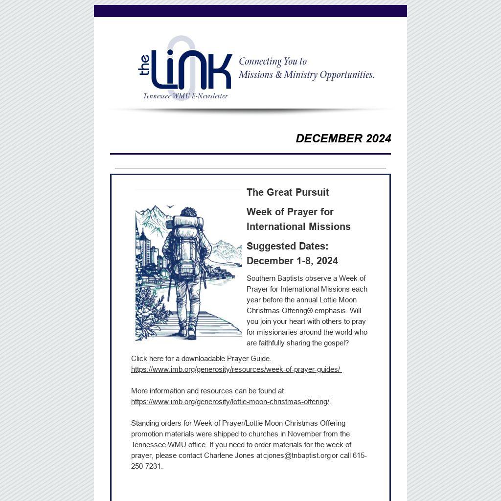 Download the TBMB December 2024 monthly prayer calendar for TBMB ministries supported by gifts from Tennessee Baptists through the Golden Offering and Cooperative Program.