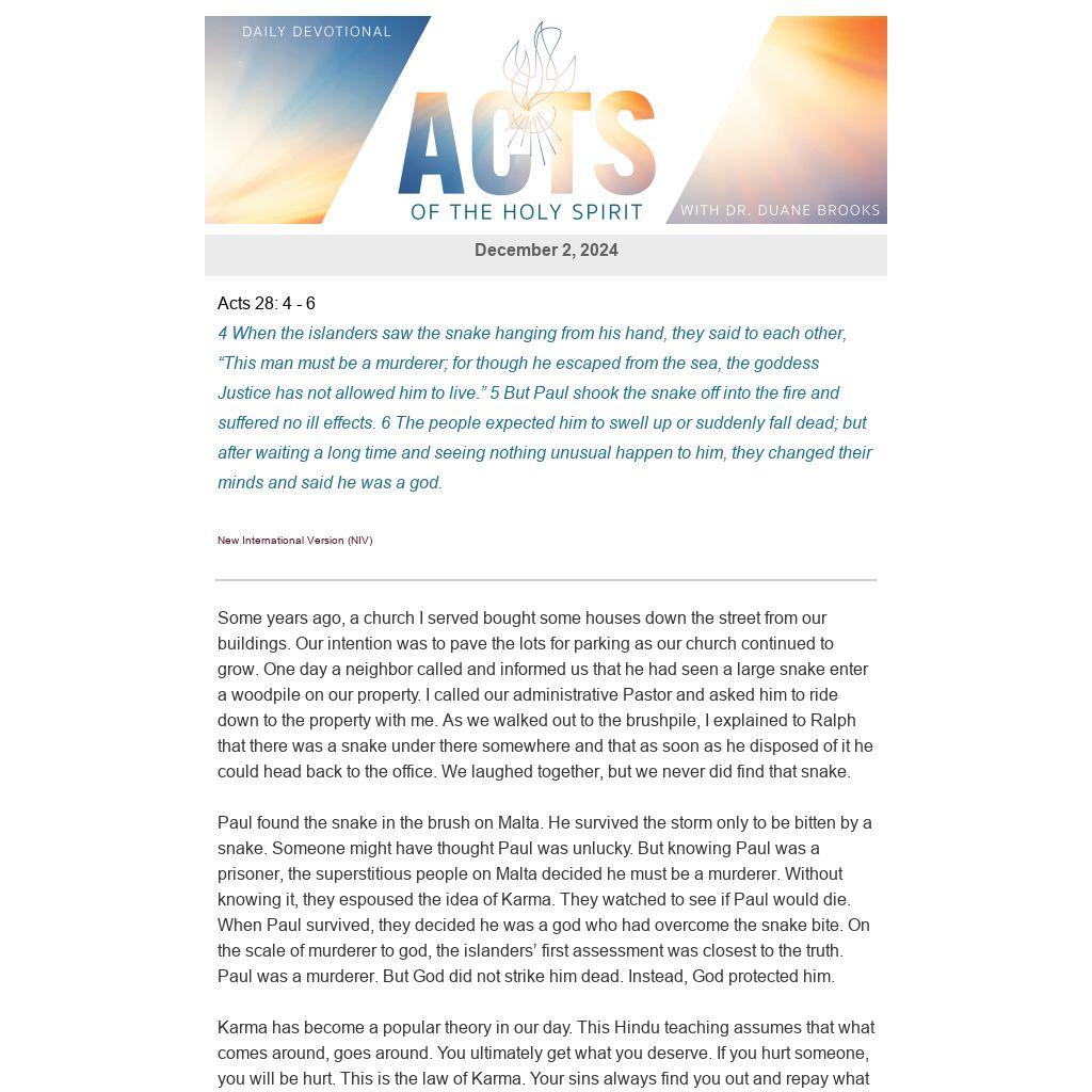 Paul found the snake in the brush on Malta. He survived the storm only to be bitten by a snake. Someone might have thought Paul was unlucky. But knowing Paul was a prisoner, the superstitious people on Malta decided he must be a murderer. Without knowing it, they espoused the idea of Karma. They watched to see if Paul would die. When Paul survived, they decided he was a god who had overcome the snake bite. On the scale of murderer to god, the islanders’ first assessment was closest to the truth. Paul was a murderer. But God did not strike him dead. Instead, God protected him.