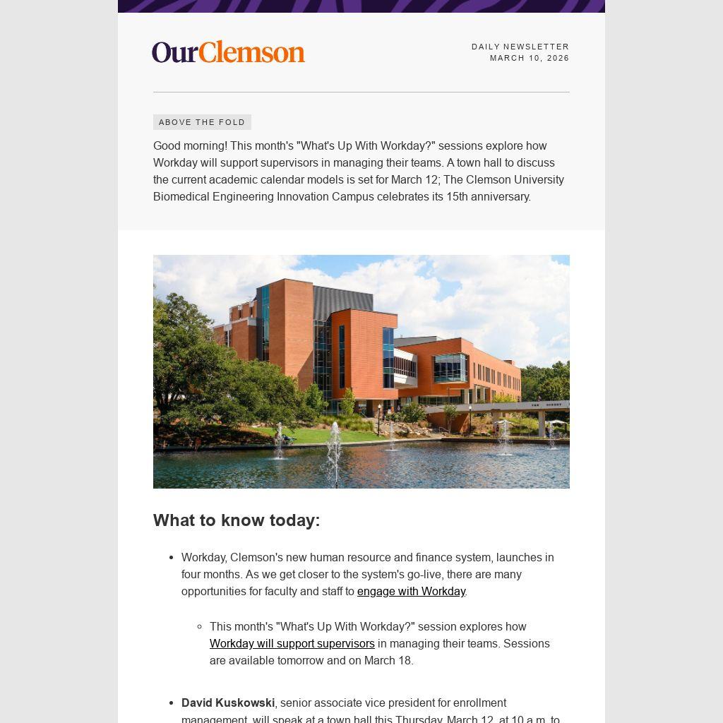 Good morning! This month's "What's Up With Workday?" sessions explore how Workday will support supervisors in managing their teams. A town hall to discuss the current academic calendar models is set for March 12; The Clemson University Biomedical Engineering Innovation Campus celebrates its 15th anniversary.
