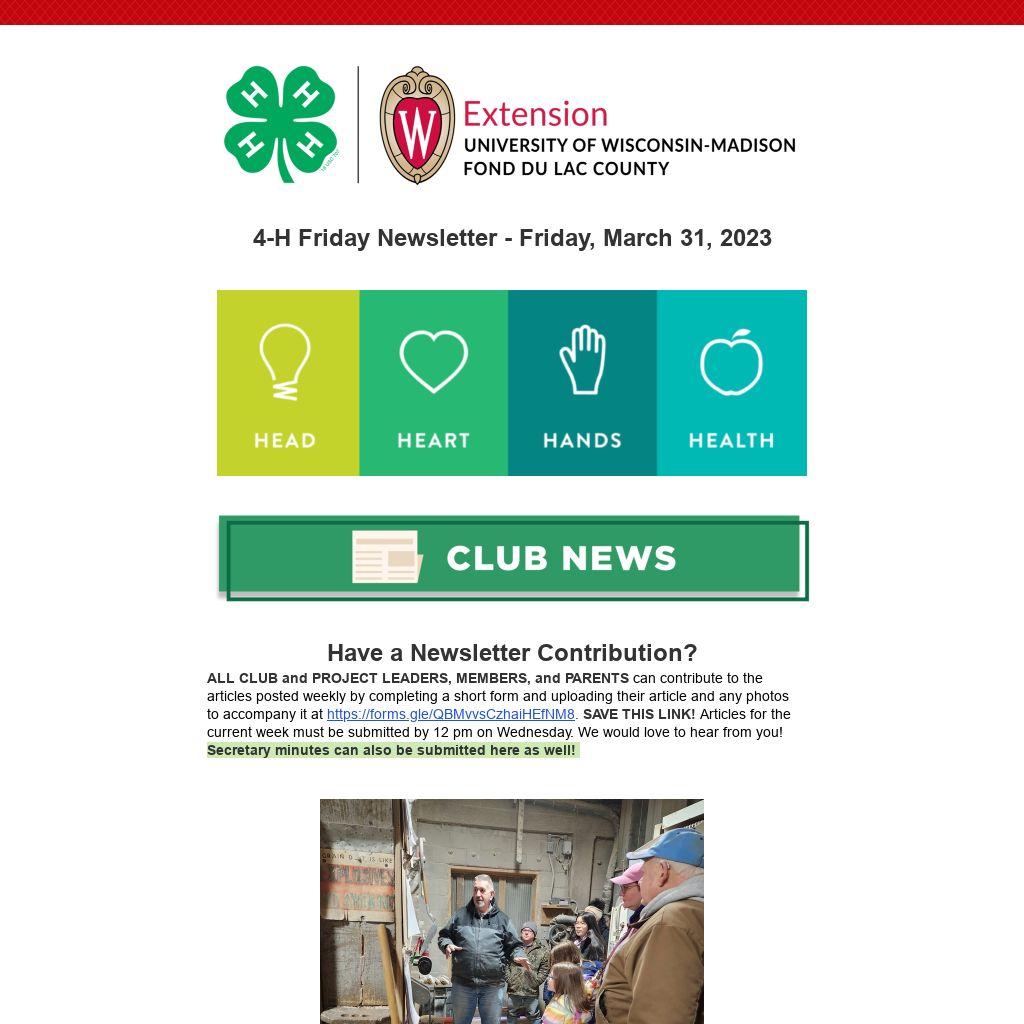 The 4-H Raffle Committee is looking for help with securing donations for the annual raffle. It would be very much appreciated if each club could please acquire at least one raffle prize. Please get raffle prize information to ann.kaiser.fdl@gmail.com, phone 920-238-5311, by April 14. Most of our prizes are mailed out to the winners, so certificates/gift cards work out the best.