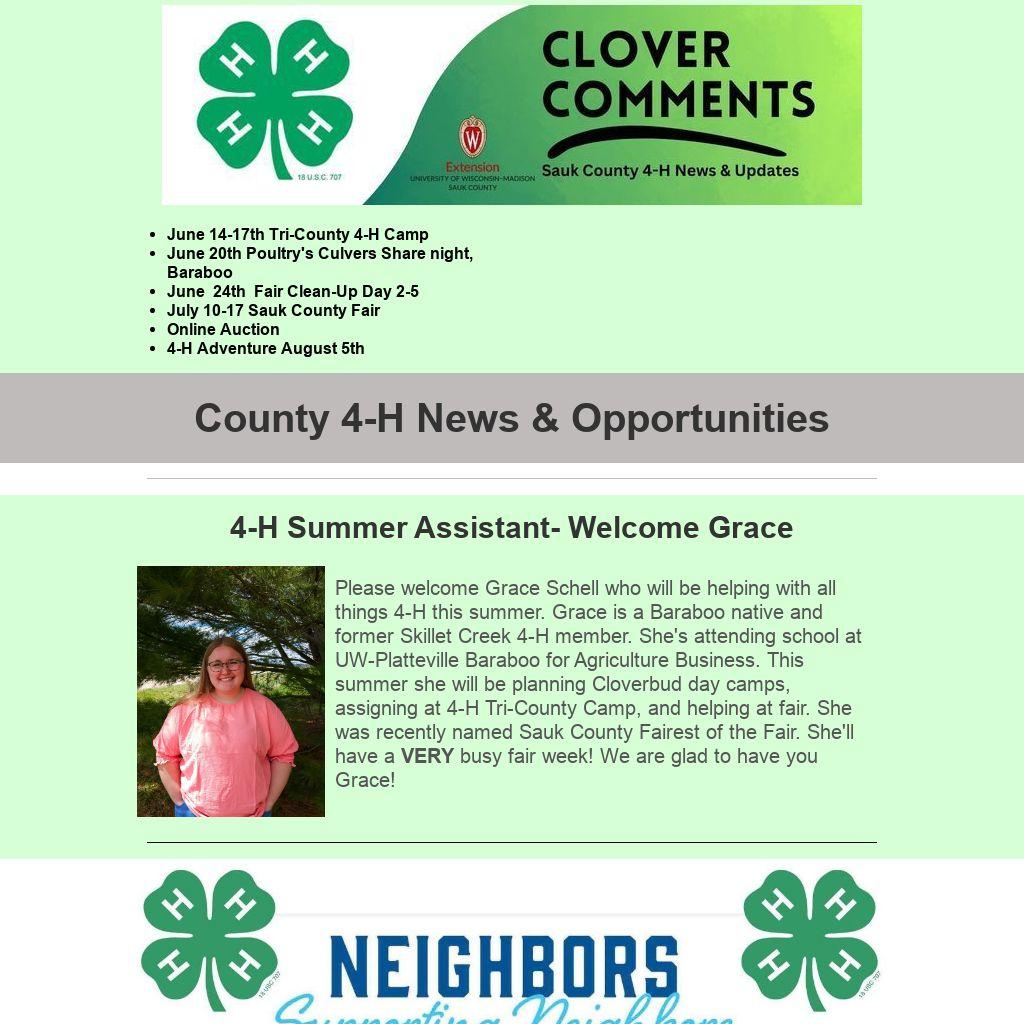 Please welcome Grace Schell who will be helping with all things 4-H this summer. Grace is a Baraboo native and former Skillet Creek 4-H member. She's attending school at UW-Platteville Baraboo for Agriculture Business. This summer she will be planning Cloverbud day camps, assigning at 4-H Tri-County Camp, and helping at fair. She was recently named Sauk County Fairest of the Fair. She'll have a VERY busy fair week! We are glad to have you Grace!