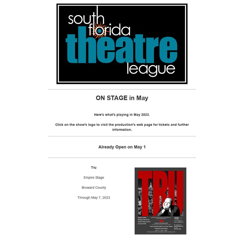 This email blast and other programs of the South Florida Theatre League are made possible with the support of Miami-Dade County Department of Cultural Affairs and the Cultural Affairs Council, the Miami-Dade County Mayor and Board of County Commissioners.