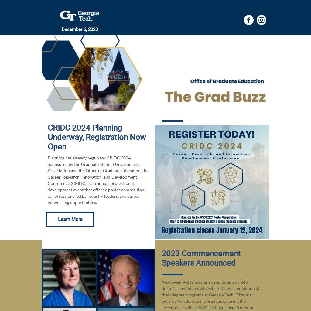 Congrats, Grads! All graduates are invited to create one last Tech memory prior to their Commencement ceremony on Friday, December 5, 2023. The annual President's Graduation Celebration takes place in the Midtown Ballroom in the Exhibition Hall, from 11 a.m. - 2 p.m. Enjoy photo opps with Buzz and the Ramblin Wreck, purchase GT alumni merchandise, and visit with representatives from the Alumni Association and Parent.