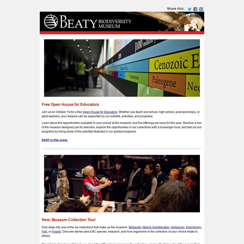 Free Open House for Educators Join us on October 19 for a free Open House for Educators. Whether you teach pre-school, high-school, post-secondary, or adult learners, your lessons can be supported by our exhibits, activities, and programs. Learn about the opportunities available to your school at the museum, and the offerings we have for this year. Receive a tour of the museum designed just for teachers, explore the opportunities in our collections with a scavenger hunt, and test out our programs by trying some of the activities featured in our guided programs.