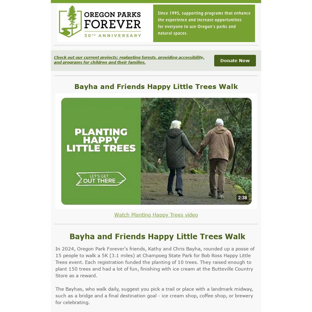 In 2024, Oregon Park Forever's friends, Kathy and Chris Bayha, rounded up a posse of 15 people to walk a 5K (3.1 miles) at Champoeg State Park for Bob Ross Happy Little Trees event. Each registration funded the planting of 10 trees. They raised enough to plant 150 trees and had a lot of fun, finishing with ice cream at the Butteville Country Store as a reward.