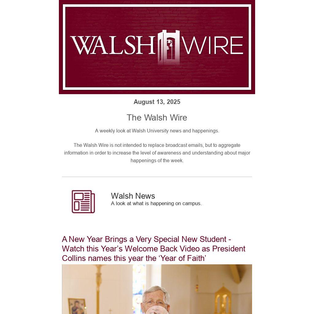 As we look ahead to the 2025-2026 academic year, Walsh University is proud to announce the Year of Faith, an opportunity to center our hearts, minds, and actions on the second of our five core values. Building upon the momentum of the Year of Community, this next chapter in our five-year values initiative invites us to deepen our spiritual lives, reflect on our shared mission, and grow in our relationship with God and one another. Rooted in our Catholic tradition and the vision of the Brothers of Christian Instruction, the Year of Faith will inspire us to explore what it means to live with purpose and conviction. Through worship, service, dialogue, and daily encounters, we will affirm that faith is not only a personal journey, but a guiding principle in how we learn, lead, and serve others.
