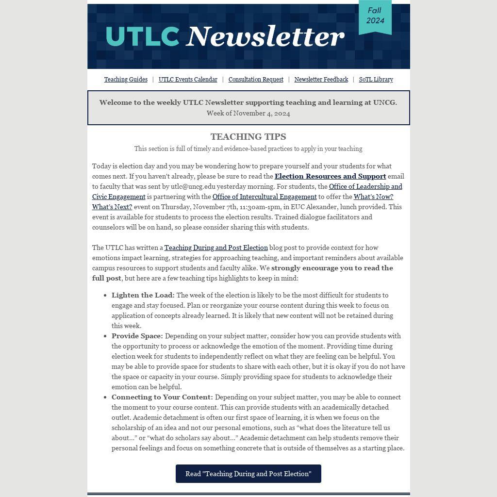 Welcome to the weekly UTLC Newsletter supporting teaching and learning at UNCG.