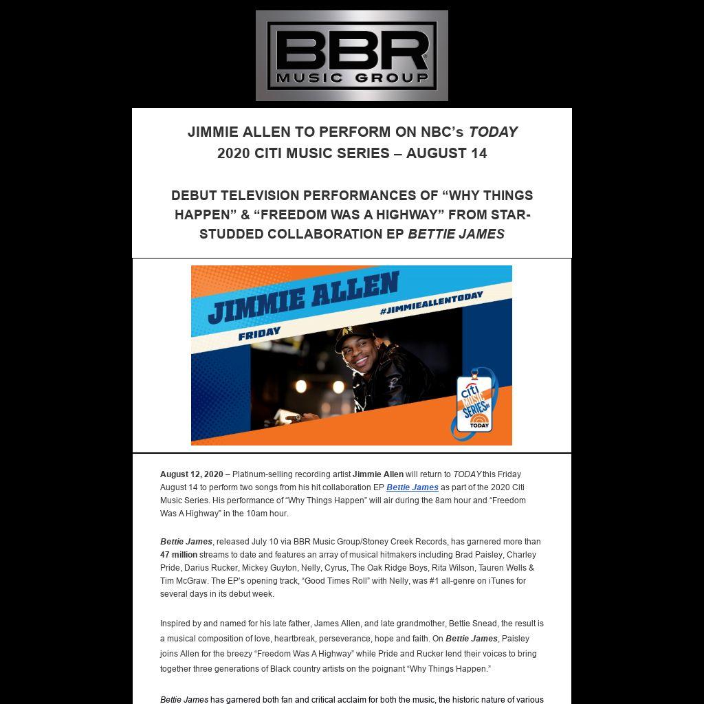 August 12, 2020 – Platinum-selling recording artist Jimmie Allen will return to TODAY this Friday August 14 to perform two songs from his hit collaboration EP Bettie James as part of the 2020 Citi Music Series. His performance of “Why Things Happen” will air during the 8am hour and “Freedom Was A Highway” in the 10am hour.