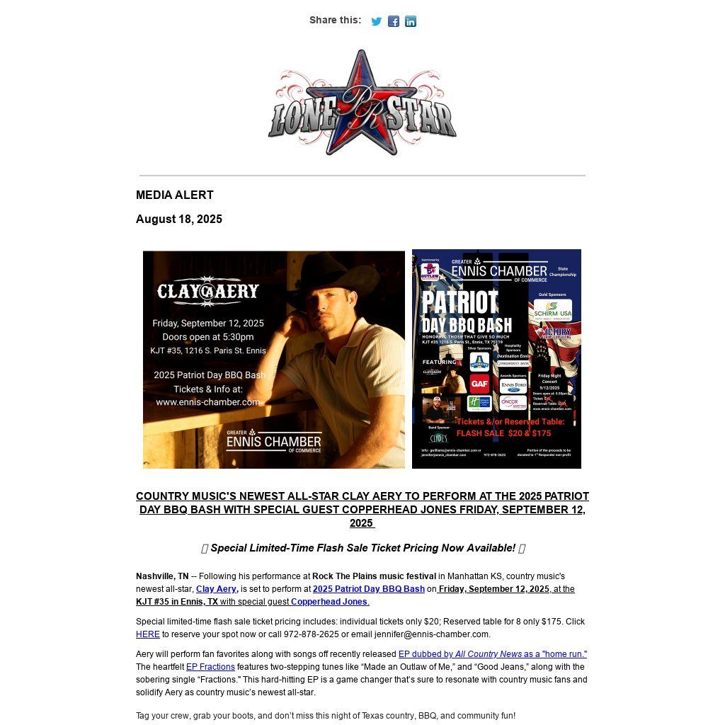 COUNTRY MUSIC'S NEWEST ALL-STAR CLAY AERY TO PERFORM AT THE 2025 PATRIOT DAY BBQ BASH WITH SPECIAL GUEST COPPERHEAD JONES FRIDAY, SEPTEMBER 12, 2025 🚨 Special Limited-Time Flash Sale Ticket Pricing Now Available! 🚨
