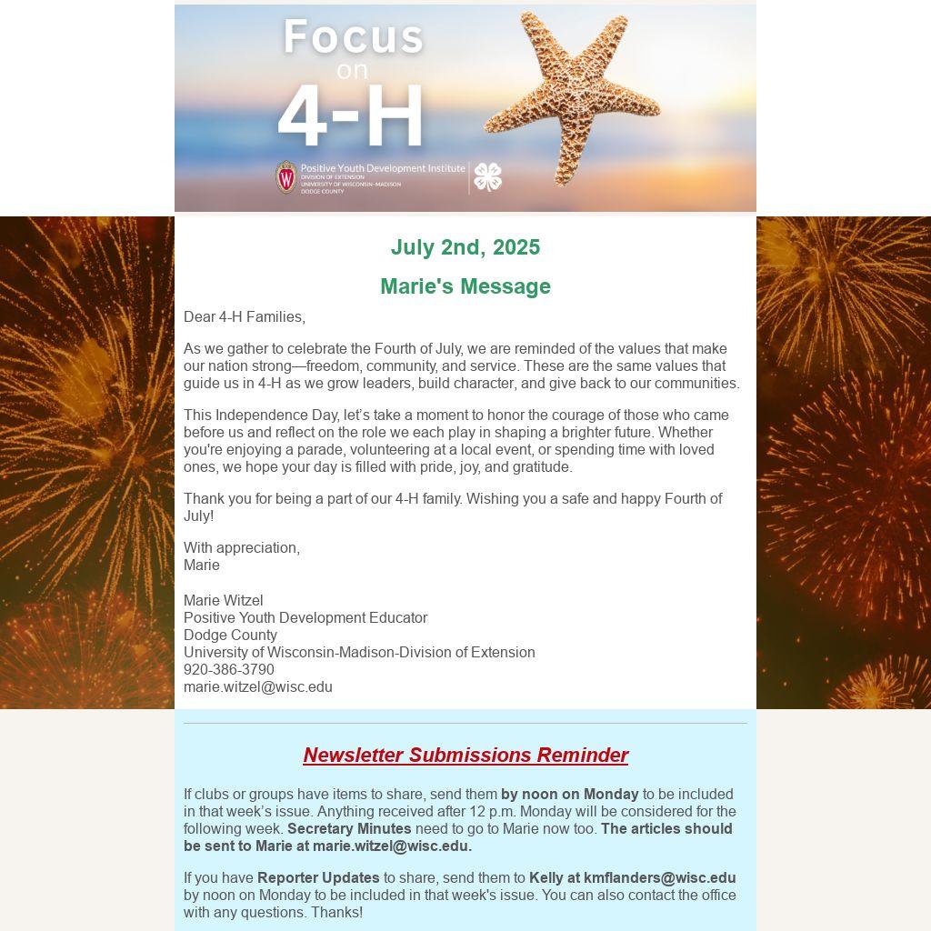 Thank you for being a part of our 4-H family. Wishing you a safe and happy Fourth of July!