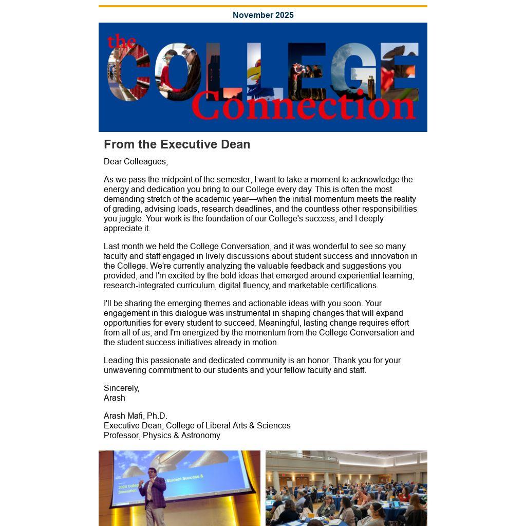 As we pass the midpoint of the semester, I want to take a moment to acknowledge the energy and dedication you bring to our College every day. This is often the most demanding stretch of the academic year—when the initial momentum meets the reality of grading, advising loads, research deadlines, and the countless other responsibilities you juggle. Your work is the foundation of our College's success, and I deeply appreciate it.
