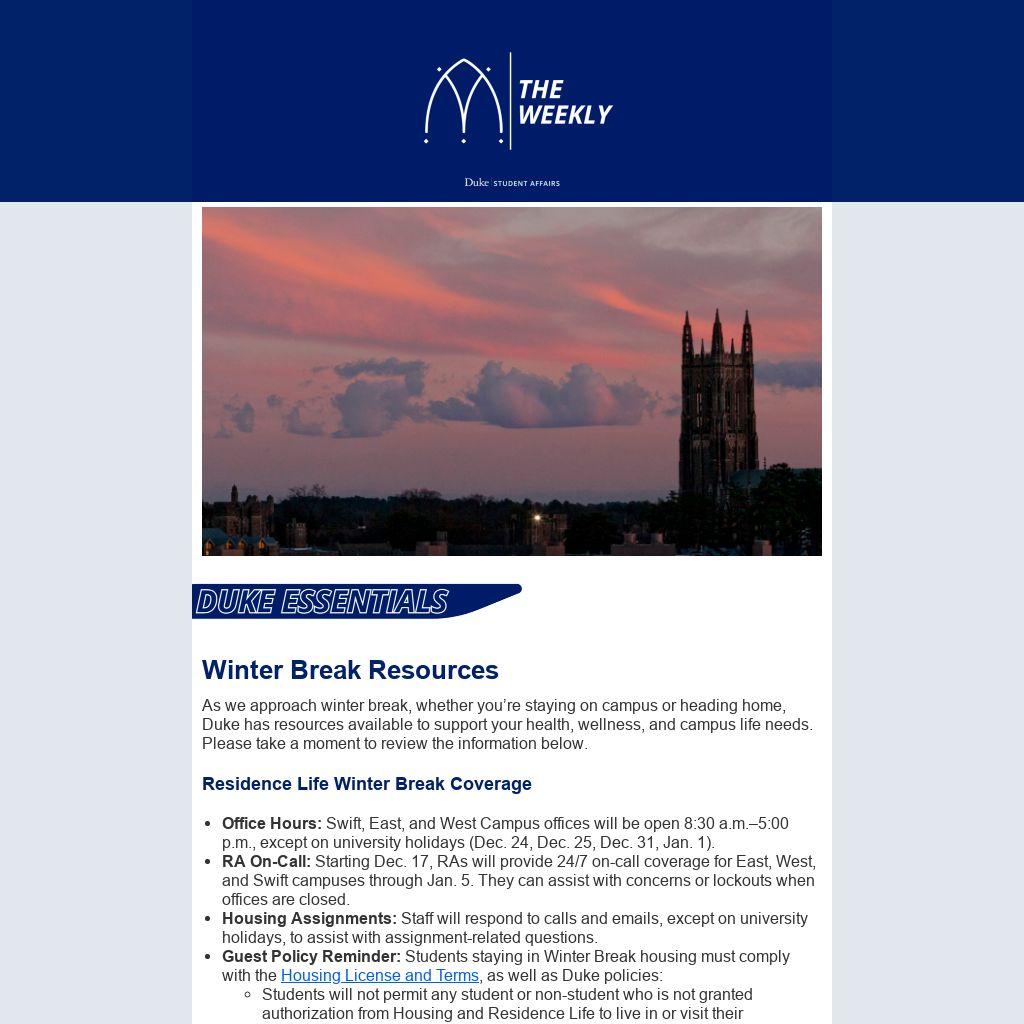 As we approach winter break, whether you’re staying on campus or heading home, Duke has resources available to support your health, wellness, and campus life needs. Please take a moment to review the information below.