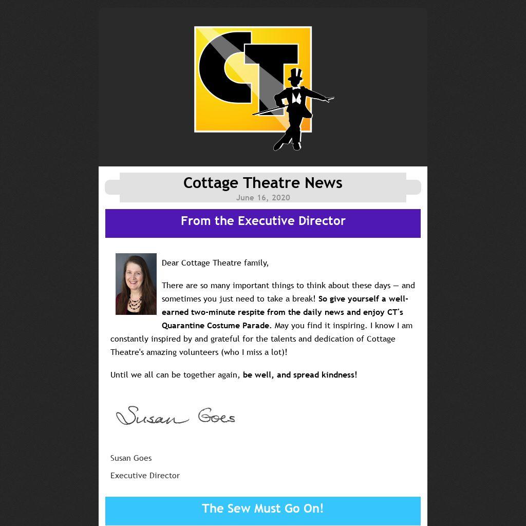 There are so many important things to think about these days — and sometimes you just need to take a break! So give yourself a well-earned two-minute respite from the daily news and enjoy CT's Quarantine Costume Parade. May you find it inspiring. I know I am constantly inspired by and grateful for the talents and dedication of Cottage Theatre's amazing volunteers (who I miss a lot)!
