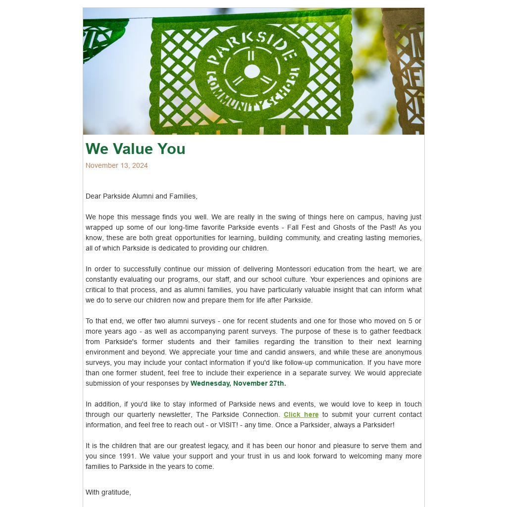 To that end, we offer two alumni surveys - one for recent students and one for those who moved on 5 or more years ago - as well as accompanying parent surveys. The purpose of these is to gather feedback from Parkside's former students and their families regarding the transition to their next learning environment and beyond. We appreciate your time and candid answers, and while these are anonymous surveys, you may include your contact information if you'd like follow-up communication. If you have more than one former student, feel free to include their experience in a separate survey. We would appreciate submission of your responses by Wednesday, November 27th.