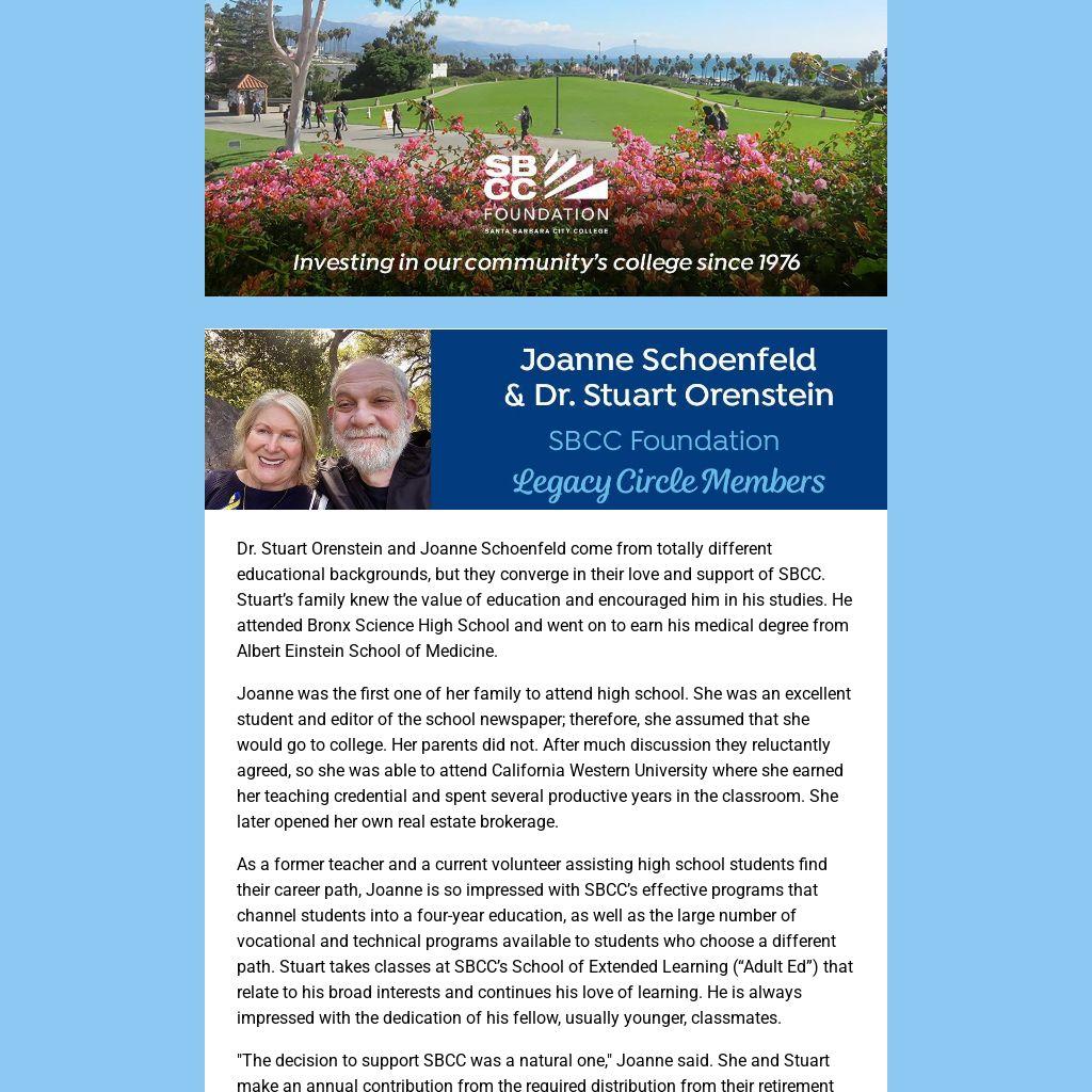 Dr. Stuart Orenstein and Joanne Schoenfeld come from totally different educational backgrounds, but they converge in their love and support of SBCC. Stuart’s family knew the value of education and encouraged him in his studies. He attended Bronx Science High School and went on to earn his medical degree from Albert Einstein School of Medicine.
