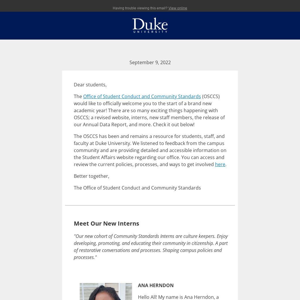 The OSCCS has been and remains a resource for students, staff, and faculty at Duke University. We listened to feedback from the campus community and are providing detailed and accessible information on the Student Affairs website regarding our office. You can access and review the current policies, processes, and ways to get involved here.