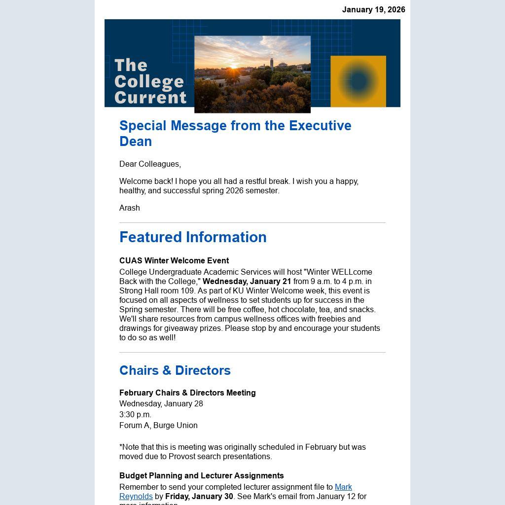 College Undergraduate Academic Services will host "Winter WELLcome Back with the College," Wednesday, January 21 from 9 a.m. to 4 p.m. in Strong Hall room 109. As part of KU Winter Welcome week, this event is focused on all aspects of wellness to set students up for success in the Spring semester. There will be free coffee, hot chocolate, tea, and snacks. We'll share resources from campus wellness offices with freebies and drawings for giveaway prizes. Please stop by and encourage your students to do so as well!