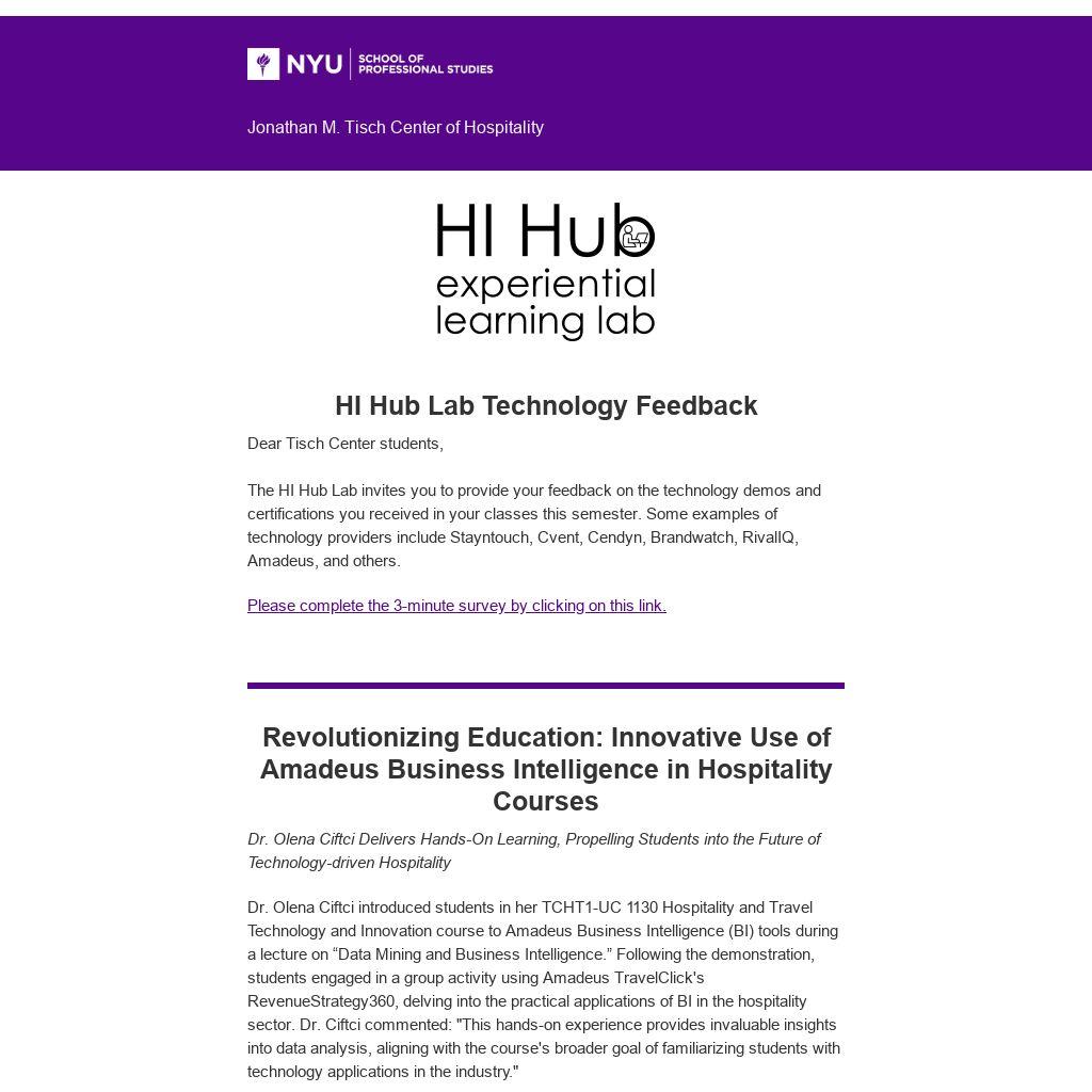 The HI Hub Lab invites you to provide your feedback on the technology demos and certifications you received in your classes this semester. Some examples of technology providers include Stayntouch, Cvent, Cendyn, Brandwatch, RivalIQ, Amadeus, and others.