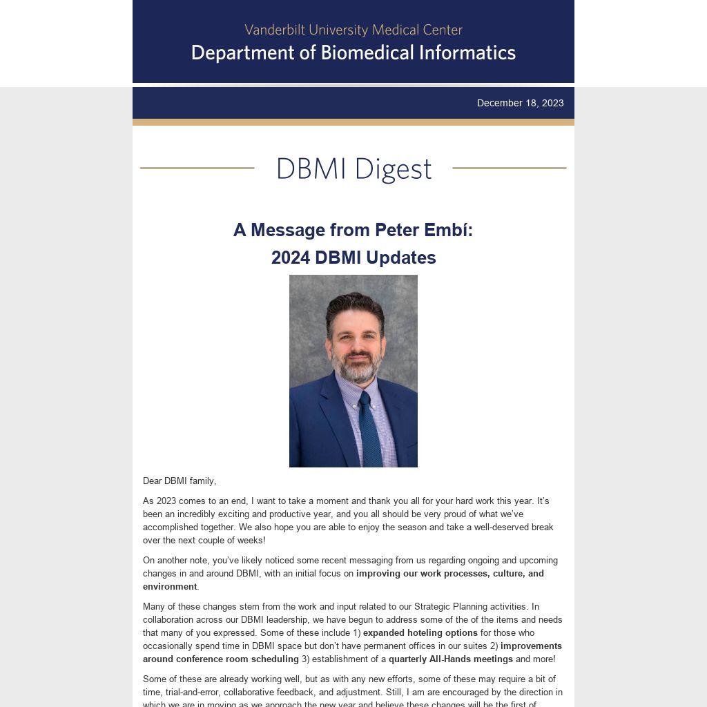 The DBMI Grand Rounds will resume on Wednesday, January 17, 2024. NOTE: We have a couple of spots open for speakers in the Spring! If you have suggestions, email lina.sulieman@vumc.org and mia.garchitorena@vumc.org!