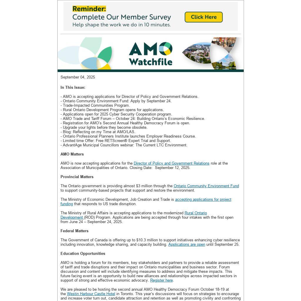 AMO is now accepting applications for the Director of Policy and Government Relations role at the Association of Municipalities of Ontario. Closing Date: September 12, 2025.
