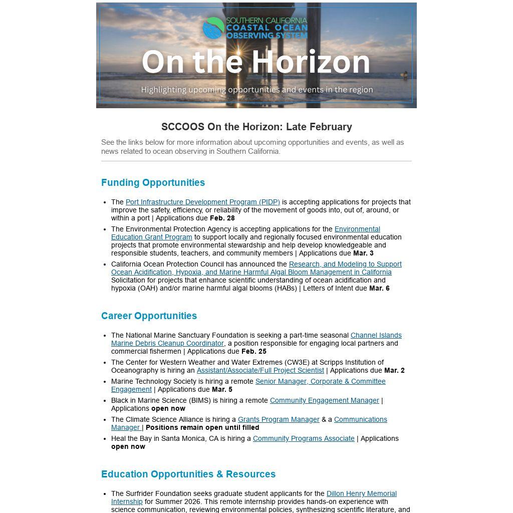 - The CSU Council on Ocean Affairs, Science & Technology (COAST) is offering paid internships in marine fisheries, ecology, policy and technology for continuing CSU undergraduate and graduate students for Summer 2026 | Applications due Feb. 25
