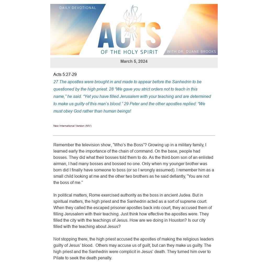 In political matters, Rome exercised authority as the boss in ancient Judea. But in spiritual matters, the high priest and the Sanhedrin acted as a sort of supreme court. When they called the escaped prisoner apostles back into court, they accused them of filling Jerusalem with their teaching. Just think how effective the apostles were. They filled the city with the teachings of Jesus. How are we doing in Houston? Is our city filled with the teaching about Jesus?