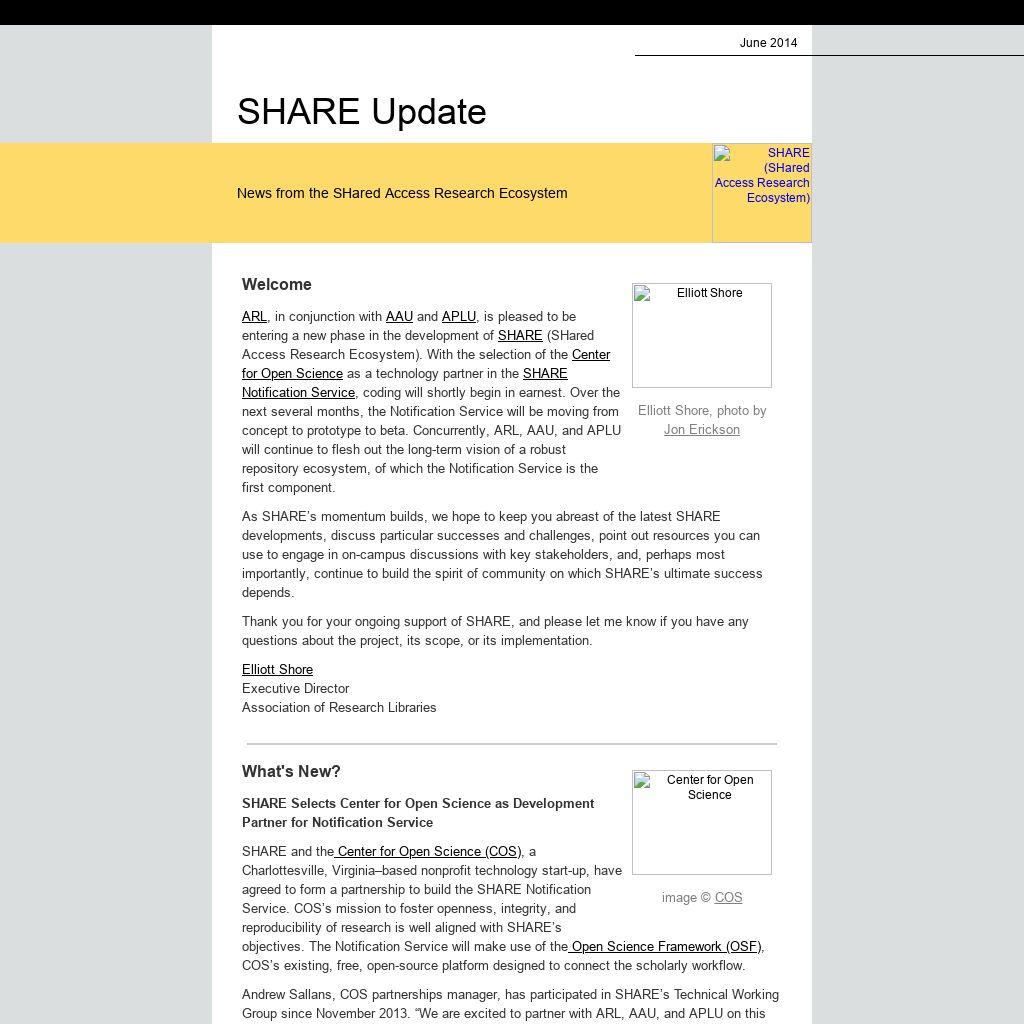 What's New? SHARE Selects Center for Open Science as Development Partner for Notification Service SHARE and the Center for Open Science (COS), a Charlottesville, Virginia–based nonprofit technology start-up, have agreed to form a partnership to build the SHARE Notification Service. COS’s mission to foster openness, integrity, and reproducibility of research is well aligned with SHARE’s objectives. The Notification Service will make use of the Open Science Framework (OSF), COS’s existing, free, open-source platform designed to connect the scholarly workflow. Andrew Sallans, COS partnerships manager, has participated in SHARE’s Technical Working Group since November 2013. “We are excited to partner with ARL, AAU, and APLU on this important community effort,” Sallans said. “This is a great opportunity to collectively build a solution that will serve many stakeholders across the entire research process.”
