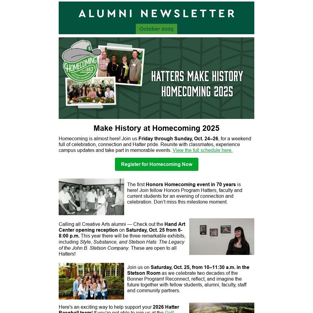 Homecoming is almost here! Join us Friday through Sunday, Oct. 24–26, for a weekend full of celebration, connection and Hatter pride. Reunite with classmates, experience campus updates and take part in memorable events. View the full schedule here.