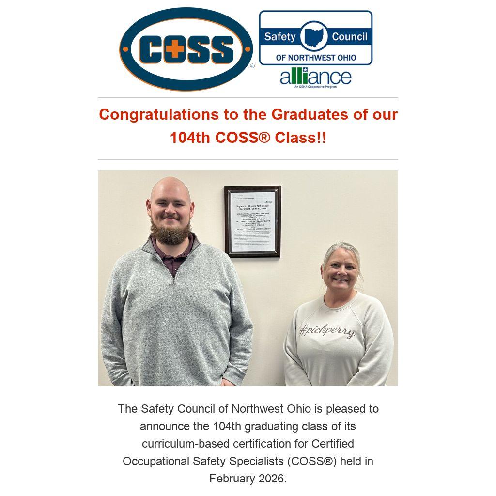 The Safety Council of Northwest Ohio is pleased to announce the 104th graduating class of its curriculum-based certification for Certified Occupational Safety Specialists (COSS®) held in February 2026.