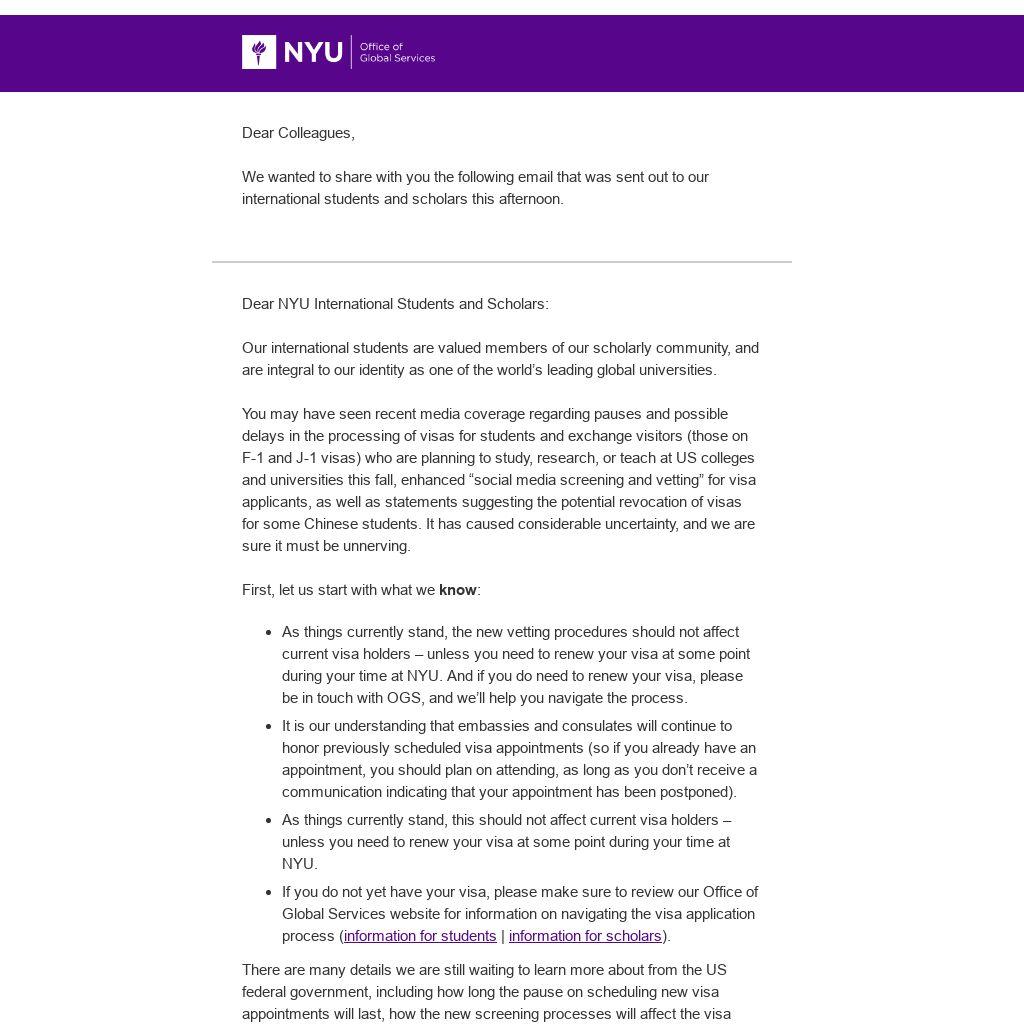 - As things currently stand, the new vetting procedures should not affect current visa holders – unless you need to renew your visa at some point during your time at NYU. And if you do need to renew your visa, please be in touch with OGS, and we’ll help you navigate the process.