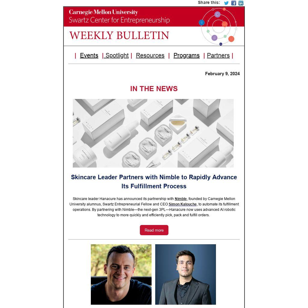 Have startup news or opportunities to share? Have questions about the Swartz Center Weekly Bulletin? Send news, opportunities or questions to Sonya Ford, Program Manager.