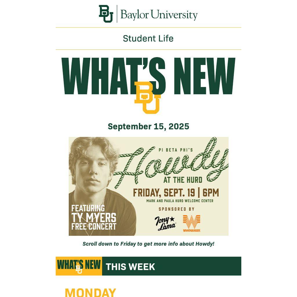 If you are a department or Baylor student organization and have items you would like to see appear in What's New BU, submit them for consideration by Friday at 8 a.m. by clicking here or emailing them to whatsnew@baylor.edu. View past issues of What’s New BU here.