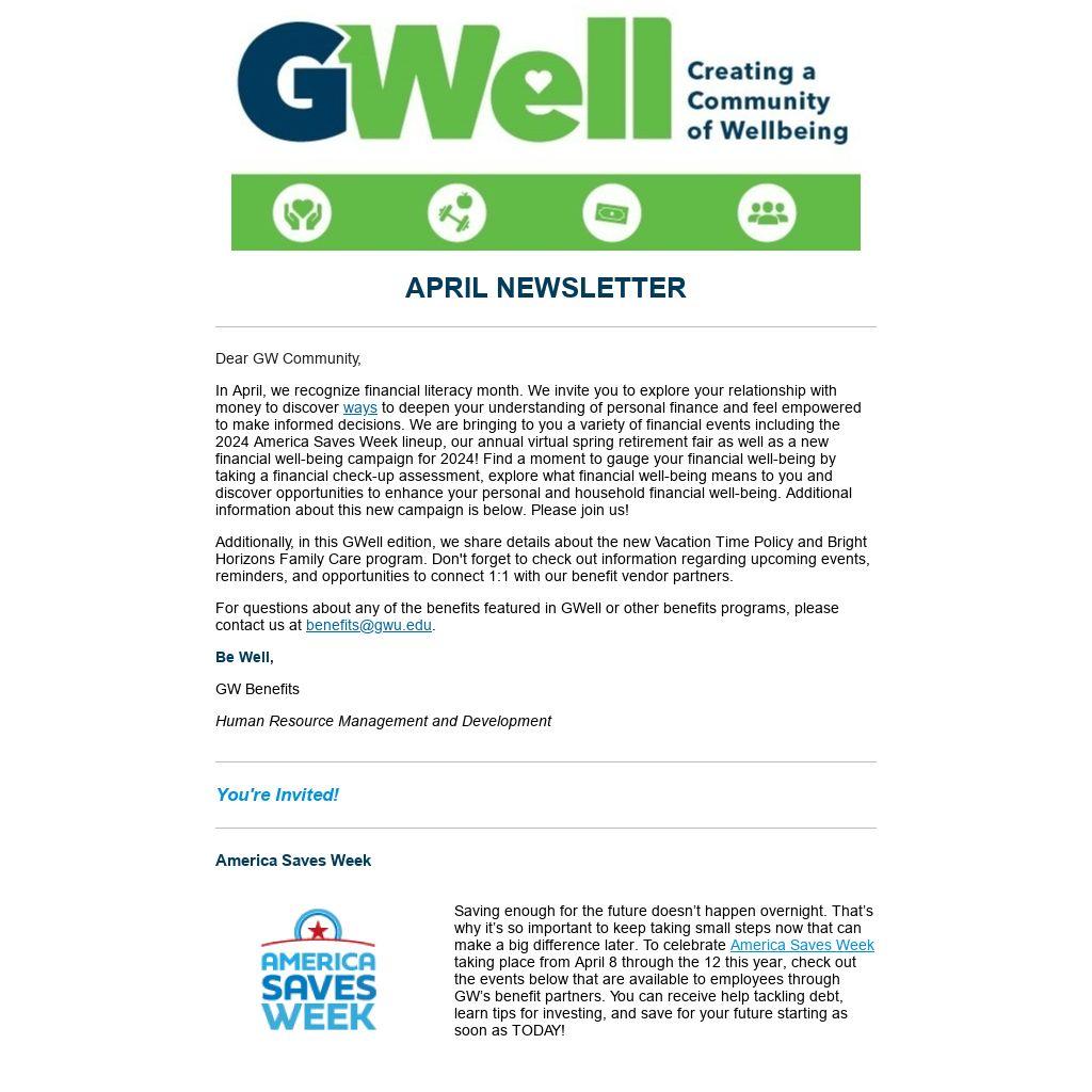 Saving enough for the future doesn’t happen overnight. That’s why it’s so important to keep taking small steps now that can make a big difference later. To celebrate America Saves Week taking place from April 8 through the 12 this year, check out the events below that are available to employees through GW’s benefit partners. You can receive help tackling debt, learn tips for investing, and save for your future starting as soon as TODAY!