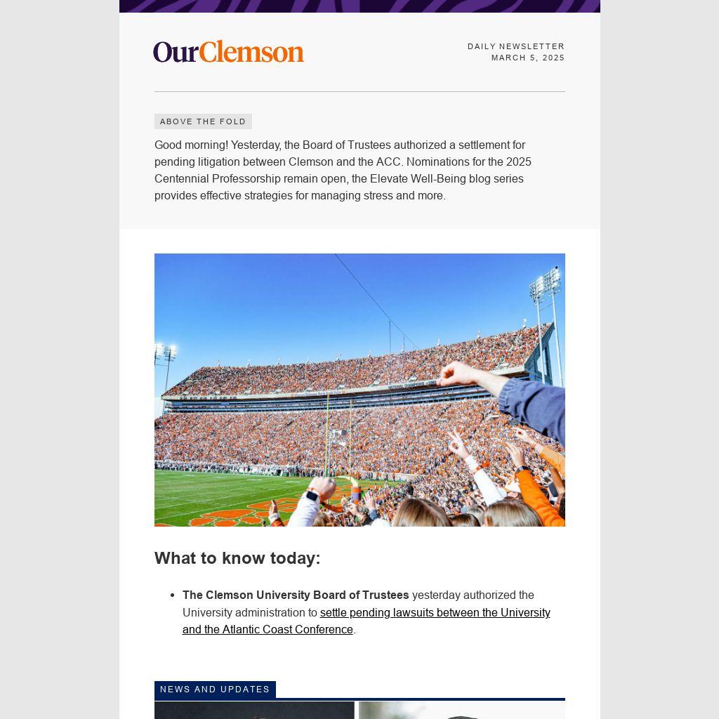 Good morning! Yesterday, the Board of Trustees authorized a settlement for pending litigation between Clemson and the ACC. Nominations for the 2025 Centennial Professorship remain open, the Elevate Well-Being blog series provides effective strategies for managing stress and more.